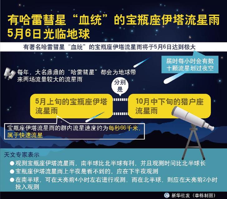 有著名哈雷彗星“血統”的寶瓶座伊塔流星雨將于5月6日達到極大,屆時每小時會有數十顆流星劃過夜空。