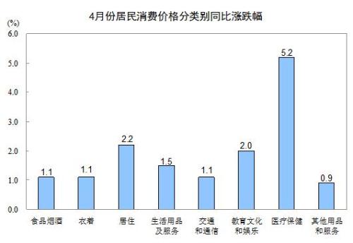 其他七大類價格同比均上漲。其中,醫(yī)療保健、居住、教育文化和娛樂價格分別上漲5.2%、2.2%和2.0%,生活用品及服務(wù)、衣著價格分別上漲1.5%和1.1%,交通和通信、其他用品和服務(wù)價格分別上漲1.1%和0.9%。