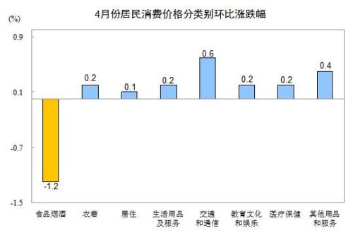 4月份,全國居民消費價格環(huán)比下降0.2%。其中,城市下降0.2%,農(nóng)村下降0.3%;食品價格下降1.9%,非食品價格上漲0.2%;消費品價格下降0.5%,服務(wù)價格上漲0.3%。