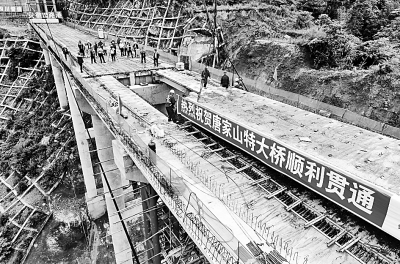 5月11日上午,隨著四川北川羌族自治縣唐家山堰塞湖跨湖大橋最后一塊橋面梁板架設完成,唐家山特大橋順利貫通,預計今年8月底具備通行能力。蒲滔攝/光明圖片