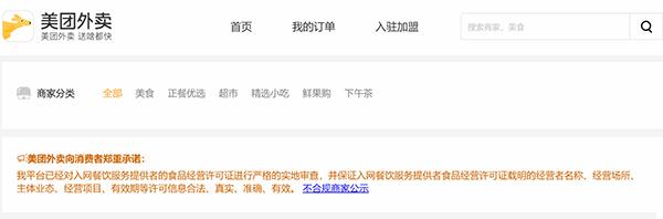 從哪里看違規(guī)餐飲店鋪公示情況?首先,打開三個外賣平臺的網(wǎng)頁版并登陸,選擇“北京地區(qū)”后,可以看到網(wǎng)頁最上端明顯位置發(fā)布了這樣的承諾:“我平臺已經(jīng)對入網(wǎng)餐飲服務(wù)提供者的食品經(jīng)營許可證進行嚴格的實地審查,并保證入網(wǎng)餐飲服務(wù)提供者食品經(jīng)營許可證載明的經(jīng)營者名稱、經(jīng)營場所、主體業(yè)態(tài)、經(jīng)營項目、有效期等許可信息合法、真實、準確、有效。”
