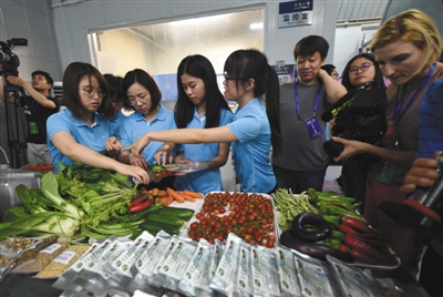 昨日,志愿者將實驗艙內(nèi)的植物帶出艙外展示。