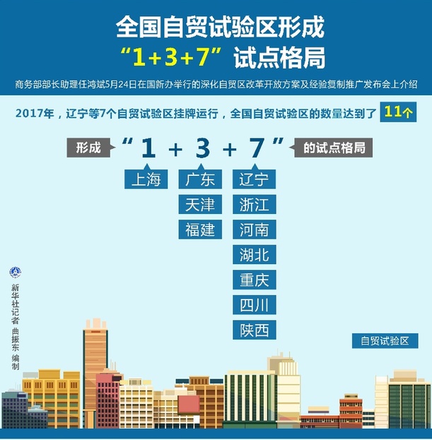 新華社北京5月24日電(記者郁瓊源)商務(wù)部部長助理任鴻斌5月24日在國新辦舉行的深化自貿(mào)區(qū)改革開放方案及經(jīng)驗復(fù)制推廣發(fā)布會上介紹,2017年,遼寧等7個自貿(mào)試驗區(qū)掛牌運行,全國自貿(mào)試驗區(qū)的數(shù)量達到了11個,形成“1+3+7”的試點格局。