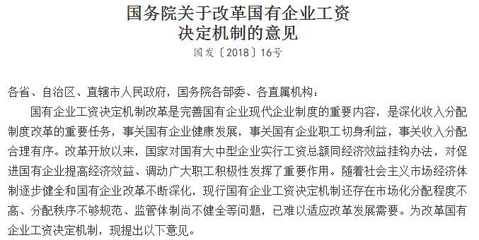 25日,國(guó)務(wù)院正式發(fā)布《關(guān)于改革國(guó)有企業(yè)工資決定機(jī)制的意見(jiàn)》,一份影響著近4千萬(wàn)國(guó)企員工工資的重磅文件正式面世!