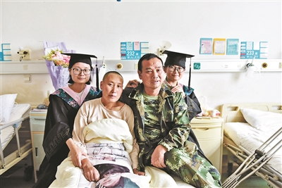 由于母親周玉梅需要在病床上休息,經過醫生同意后,李夢楠花20元為母親租了輪椅,在醫院的樓道和病房里與同學們一起拍了合影。照片里,周玉梅戴上了女兒的學士帽,微笑著面對鏡頭。