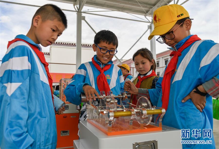 幾名學生在拉薩市流動科技館巡展活動現場體驗科學小實驗(5月24日攝)。 新華社記者 劉東君 攝