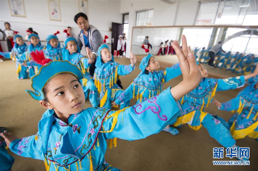 江蘇省南通市海安縣西場小學學生在練習京劇(5月26日攝)。新華社發(徐勁柏 攝)