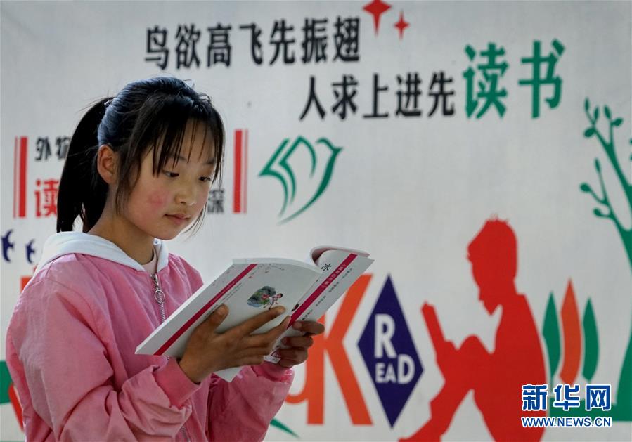 河南焦作市博愛縣寨豁鄉小學學生郭艷冰在校內閱讀從“焦作市圖書館館外流通點”借閱的書籍(4月18日攝)。新華社記者 李安 攝