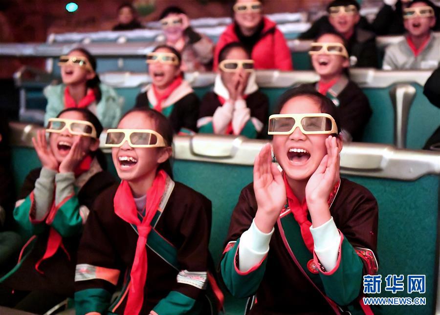 在廣西柳州市景行小學柳東校區,來自三江侗族自治縣和融安縣大山里的留守兒童觀看3D動畫片(1月4日攝)。當日,柳州市舉行關愛留守兒童城市圓夢活動。新華社發(黎寒池 攝)