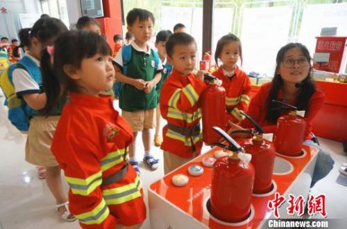 資料圖:兒童節孩子們穿上迷你消防服,體驗模擬滅火。 韓章云 攝