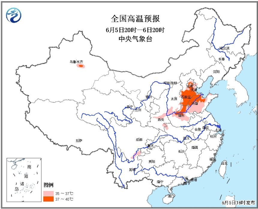 高溫天氣主要影響京津冀地區(qū)。5日至6日,北京、天津、河北中南部、山東北部和西部、河南北部以及陜西關(guān)中地區(qū)最高氣溫可達35℃~38℃,局地可達39℃~40℃。7日,高溫范圍收縮,主要影響河南北部、山東北部等地。
