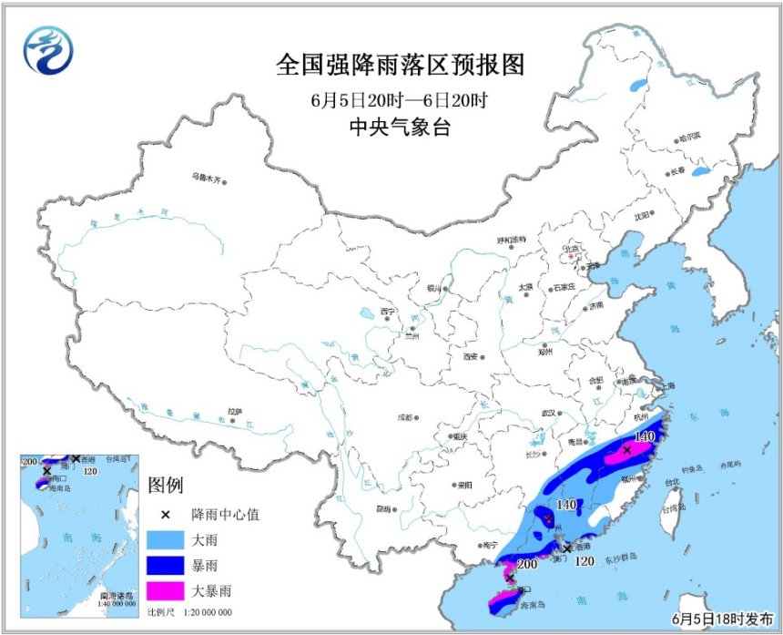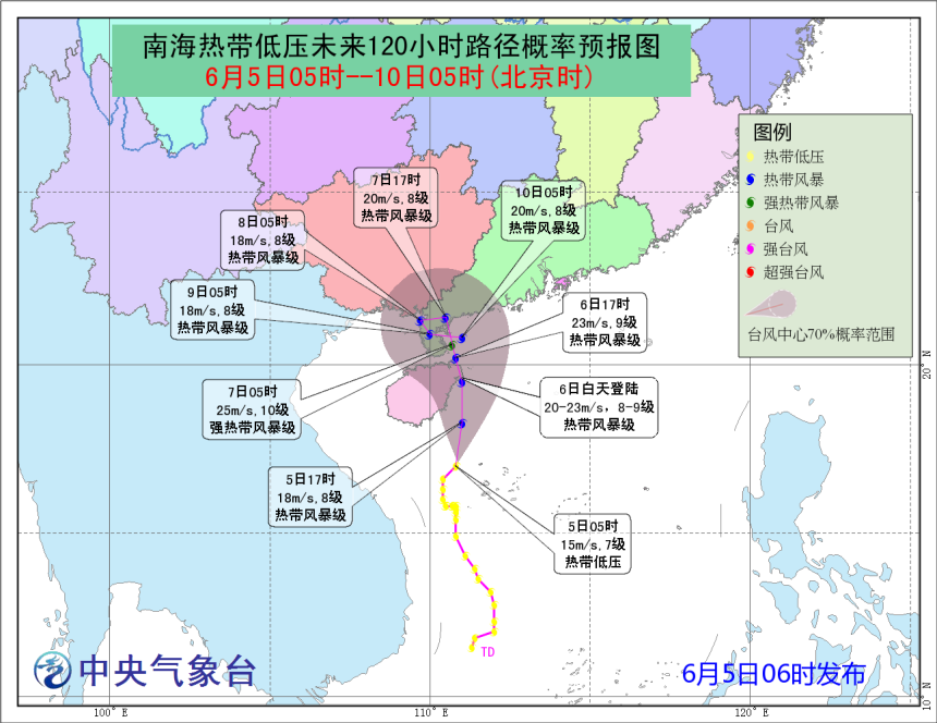 許映龍:南海的熱帶低壓于6月5日8時加強為今年第4號臺風。5日16時,第4號臺風的中心位于海南省文昌市東偏南方向約85公里的海面上,中心附近最大風力有8級(18米/秒)。目前,第4號臺風以每小時20公里左右的速度向北偏西方向移動,并逐漸向我國海南東南部沿海靠近,并將于5日夜間至6日上午擦過或登陸海南東北部沿海(熱帶風暴級,20-23米/秒,8-9級),6日下午至7日早晨登陸廣東西部沿海(熱帶風暴-強熱帶風暴級,20-25米/秒,8-10級)。