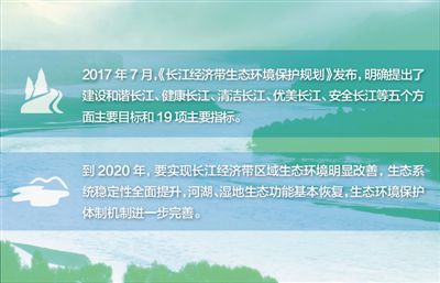 長江大保護,規劃先行。2016年,《長江經濟帶發展規劃綱要》印發。去年7月,《長江經濟帶生態環境保護規劃》發布,提出了建設和諧長江、健康長江、清潔長江、優美長江、安全長江等五個方面主要目標和19項主要指標——到2020年,要實現長江經濟帶區域生態環境明顯改善,生態系統穩定性全面提升,河湖、濕地生態功能基本恢復,生態環境保護體制機制進一步完善;地表水質量國控斷面(點位)達到或優于Ⅲ類水質比例達到75%以上,劣Ⅴ類比例小于2.5%,地級及以上城市集中式飲用水水源水質達到或優于Ⅲ類比例達到97%以上。