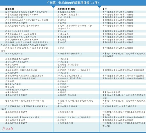 據悉,廣州自去年10月起已啟動“減證便民”專項工作,由市編辦牽頭,會同市法制辦、市政務辦對市政府各部門的證明事項進行梳理審核。經研究,市政府第一批取消7個部門共33項證明事項,其中市教育局13項、市人力資源社會保障局10項、市公安局4項、市司法局3項、市民政局1項、市交委1項、市食品藥品監管局1項。
