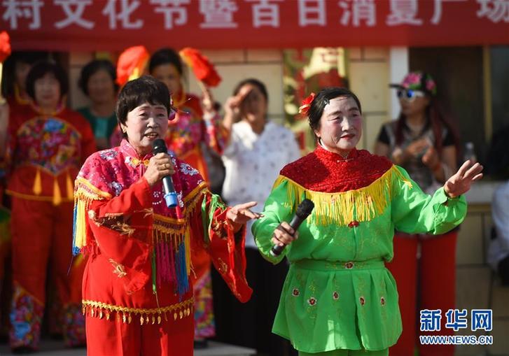 在內蒙古鄂爾多斯市杭錦旗獨貴塔拉鎮芒哈圖村舉辦的“民生集市”上,民間文藝團體的演員在表演二人臺(6月8日攝)。新華社記者 彭源 攝