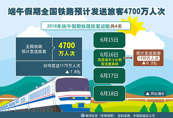 新華社北京6月13日電(記者樊曦)記者13日從中國鐵路總公司獲悉,為期4天的2018年端午假期鐵路旅客運輸將于6月15日啟動,全國鐵路預計發送旅客4700萬人次。