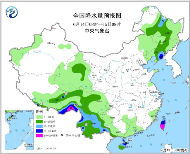 張濤:由于雨帶南移,南方強降水范圍已經減小,因此中央氣象臺13日6時解除暴雨藍色預警,但預計13日8時至14日8時,廣東南部沿海、廣西南部、云南西部和東北部、西藏東南部、四川西部等地有大雨或暴雨(50~90毫米),部分地區并伴有短時強降水,局地有雷暴大風和冰雹。14日以后,廣東、廣西地區降雨整體減弱,華南地區降雨主要集中在雷州半島沿海一帶和海南中北部地區以及南海北部海面上。可能出現伴有短時強降水、雷暴大風或冰雹等強對流天氣。
