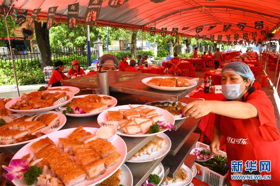 6月14日,工作人員在廣州天河區珠村七夕廣場準備龍舟飯。當日,廣州市天河區舉行一場熱鬧歡快的龍舟活動,來自多個村莊“走親戚”的龍舟隊參加。按廣州的傳統習俗,每年農歷五月初一至初五,各村的龍舟隊要到周圍村落“走親戚”。走親戚的龍舟隊到來時,受訪村子要準備好龍舟飯招待來客?;顒赢斕欤Q炮敲鑼,一派喜慶氣氛。新華社記者 鄧華 攝