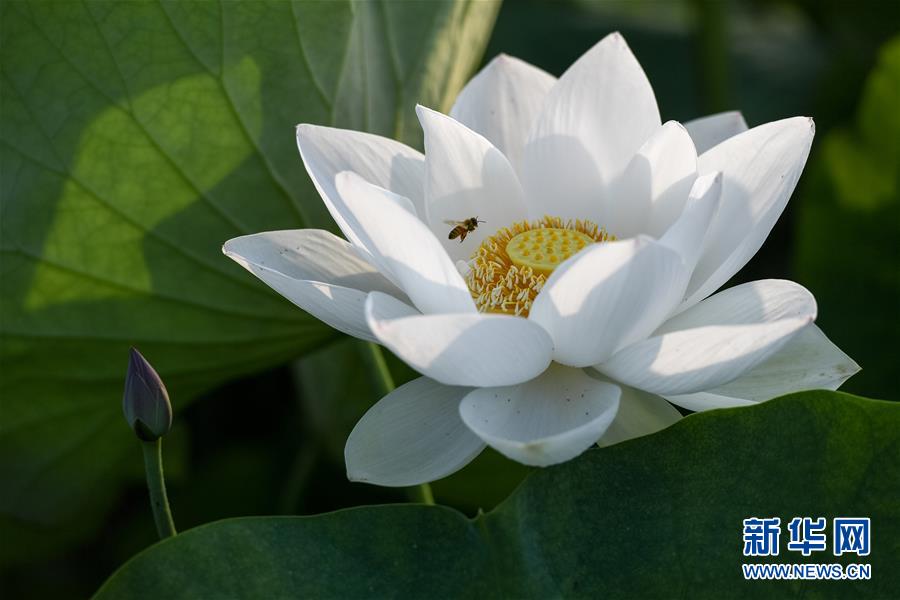 6月14日,在銅陵市西湖村荷花園內,一只蜜蜂飛向盛開的荷花。隨著氣溫升高,安徽省銅陵市西聯鎮西湖村荷花園內的300多畝荷花絢麗綻放,吸引游客前來賞荷。 新華社記者 張端 攝