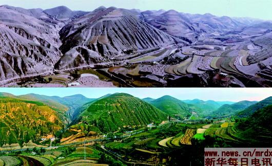 退耕還林20載,“黃土地”刷出“新顏值”。延安市吳起縣鐵邊城鎮上營盤山退耕前(上圖)與退耕后(下圖)對比(資料照片)。