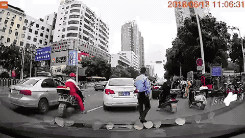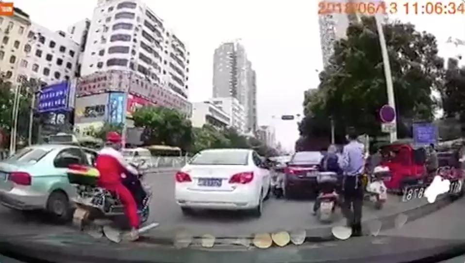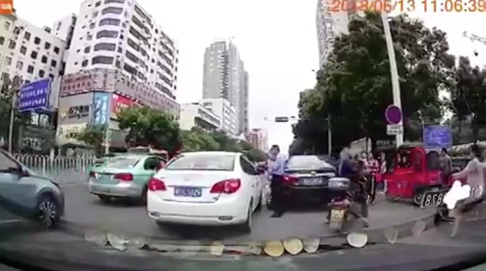 視頻顯示,6月13日中午11點06分,一名在湖南衡陽街頭執(zhí)勤的交警正要對一輛車號為“湘DE**26”的白色轎車進行執(zhí)法。就在該轎車停車的瞬間,這名交警毫無征兆地倒在地上,而那輛白色的轎車本能地向后退了一下。