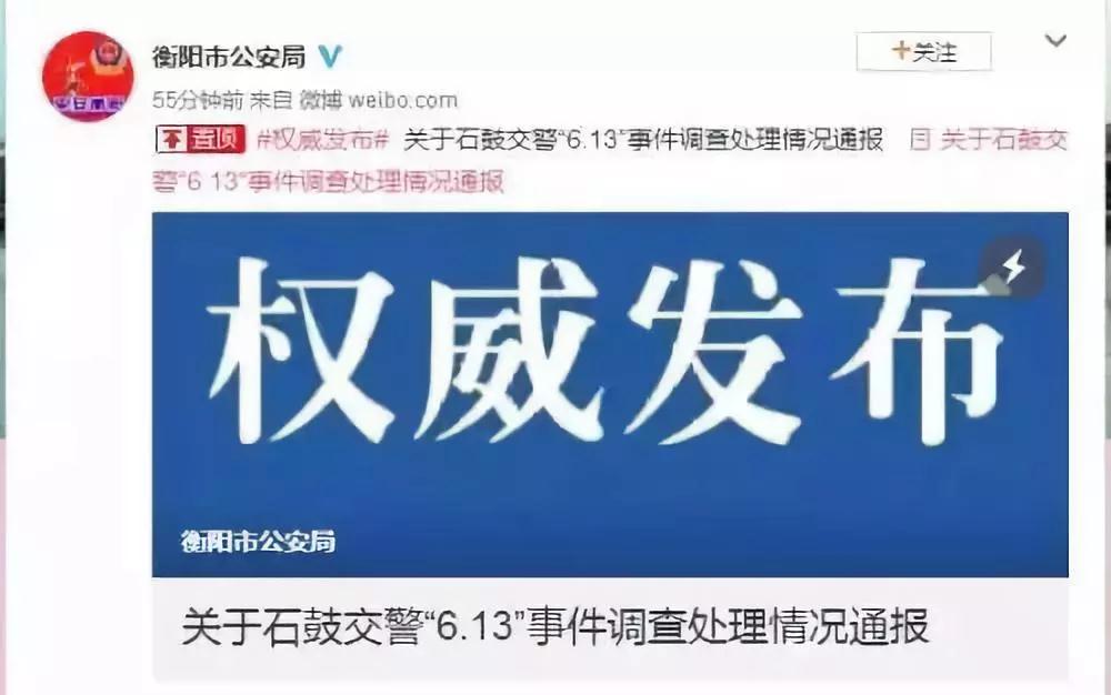今天,湖南省衡陽市公安局官方微博發(fā)布“關(guān)于石鼓交警“6.13”事件調(diào)查處理情況通報”。