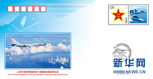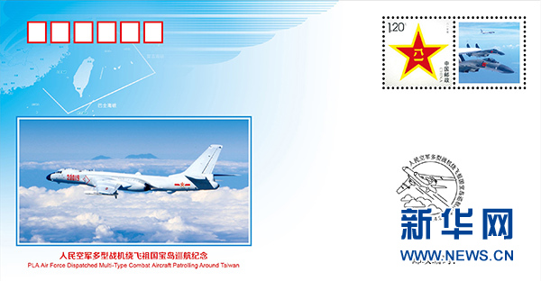 這次發行的一套兩枚中英文版紀念封,是中國集郵總公司根據新華社公開播發的有關報道和新聞照片設計制作,記錄了空軍轟-6K等多型戰機多次繞飛祖國寶島巡航的航跡。