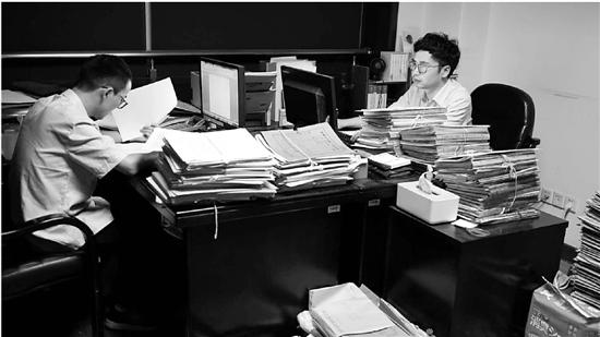 晚上8點多的法院燈火通明,辦公室里案卷如山,案卷能夠多到什么程度?比如一件非法吸收公眾存款的案件,受害人數百上千,單單受害人筆錄有時候就是好幾推車。纖弱的書記員姑娘往往需要推著小推車輸送案卷,而法官們有時候則不得不踮著腳尖在辦公室里查閱翻看。