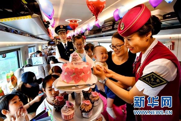 6月26日,在北京南至上海虹橋的G1次“復興號”列車上,乘務員與旅客一起切蛋糕慶祝。當日,由北京南至上海虹橋的G1次“復興號”列車上舉行“復興號”運營一周年慶?;顒印!皬团d號”是由中國鐵路總公司牽頭組織研制、具有完全自主知識產權、達到世界先進水平的中國標準動車組,自2017年6月26日投入運營以來,以其良好的乘車體驗廣受旅客歡迎。新華社發(楊寶森 攝)