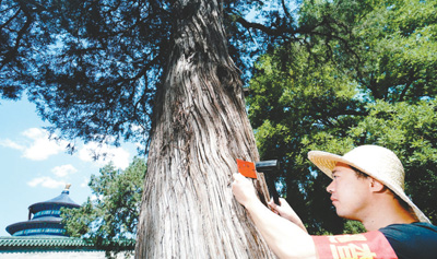 6月27日,北京天壇公園管理處工人為祈年殿前的一株古樹掛上一級古樹銘牌。賀 勇攝