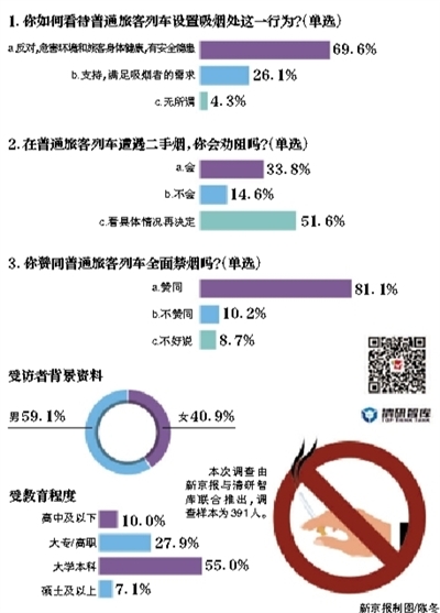 2017年6月,因在普通旅客列車上遭遇二手煙,大學(xué)生李華將哈爾濱鐵路局告上法庭,索賠購票款102.5元,同時(shí)要求取消有關(guān)站臺及該趟列車內(nèi)的吸煙區(qū)、拆除煙具,禁止在上述區(qū)域吸煙,并賠償精神損失費(fèi)人民幣1元等。6月25日下午,北京鐵路運(yùn)輸法院作出一審判決,要求鐵路局在相關(guān)列車上拆除煙具,取消吸煙區(qū)。被告人哈鐵局稱,“我國有3億吸煙者,提高服務(wù)質(zhì)量應(yīng)體現(xiàn)在對上述人群進(jìn)行疏導(dǎo)而不是全面禁煙”。對此,我們需要關(guān)注什么?本期“京報(bào)調(diào)查”(新京報(bào)與清研智庫聯(lián)合推出)就此展開調(diào)查。