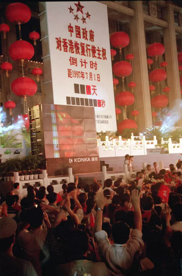 1997年7月1日零點,在天安門廣場參加北京市人民迎接香港回歸祖國聯歡會的人們觀看香港政權交接儀式的電視直播。中國政府對香港恢復行使主權倒計時牌標出:距1997年7月1日還有零天,零秒。新華社發