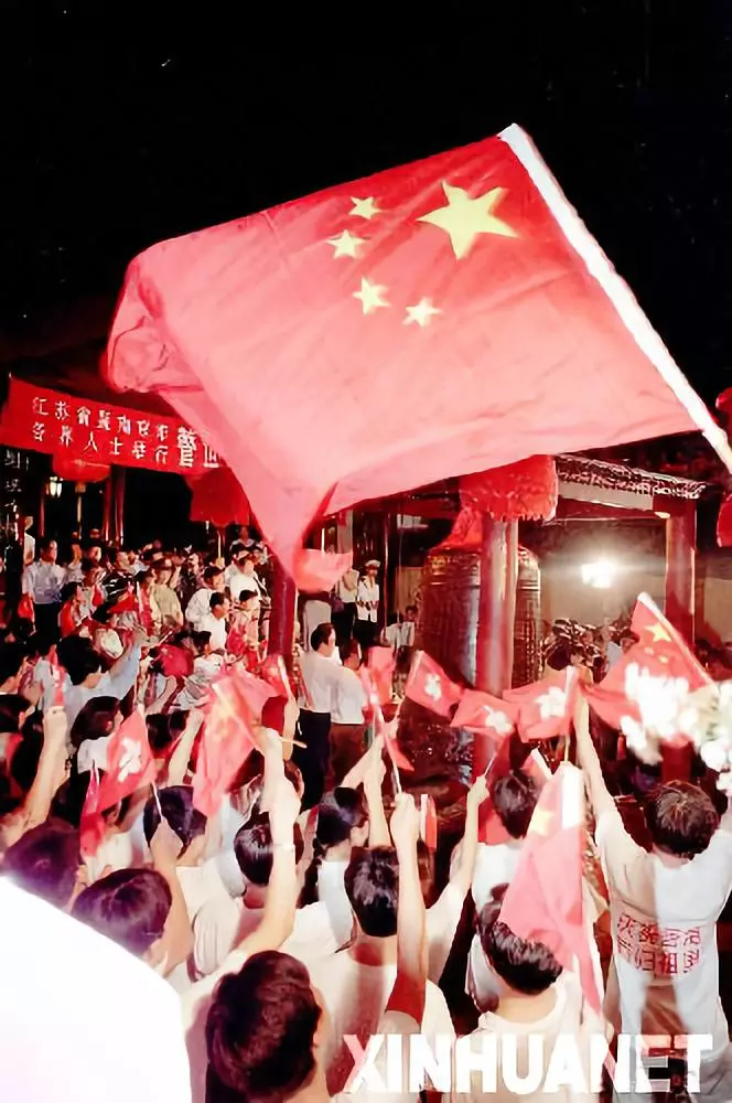 1997年6月30日晚,江蘇省南京市各界群眾代表在當年《南京條約》議約地南京靜海寺舉行撞響“警世鐘”儀式。靜海寺大鐘一共敲響了155下,寓意香港離開祖國155年后又回到祖國的懷抱。新華社 發