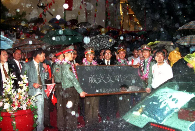 1997年7月1日清晨,中國人民解放軍駐香港部隊進入香港,受到香港市民的熱烈歡迎。新界區各界代表向駐香港部隊贈匾,贊解放軍為“威武文明之師”。新華社記者 王建民 攝