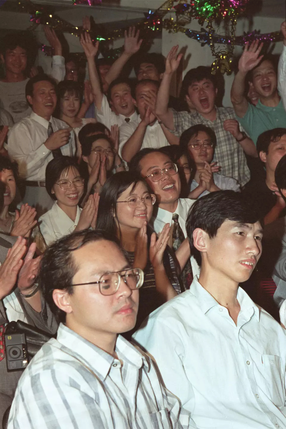1997年6月30日,世界各地的華人華僑及中國留學生以各種方式慶祝香港回歸祖國。在日本日中友好會館后樂寮留學生宿舍舉行的聯歡晚會上,中國留學生在觀看香港政權交接儀式電視現場直播時,激動萬分。新華社記者 陳建力 攝