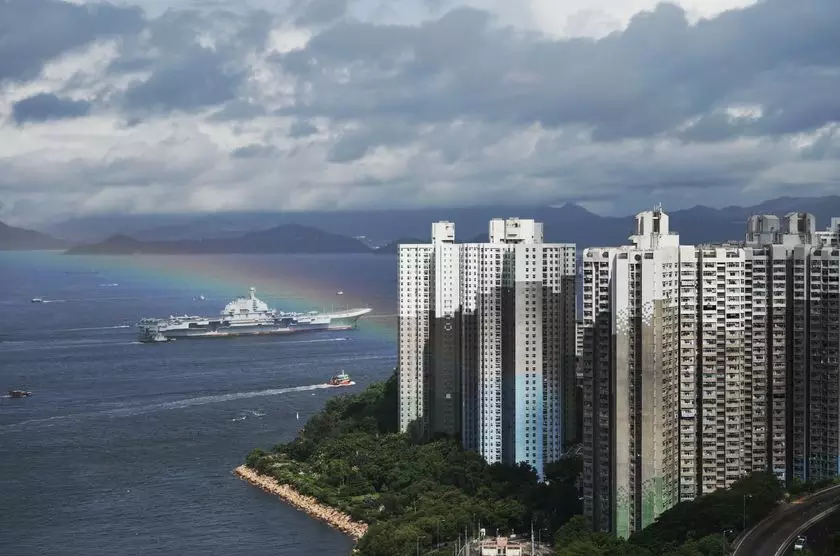 2017年7月7日,海軍遼寧艦在香港南丫島附近航行。當日,正在執行跨區機動訓練任務的中國人民解放軍海軍航母編隊抵達香港,參加香港回歸祖國暨中國人民解放軍進駐香港20周年慶祝活動,受到香港特區政府和民眾熱烈歡迎。 新華社發(王申攝)
