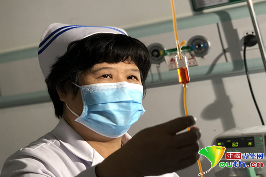 杜麗群在觀察艾滋病患者的點滴情況。廣西南寧市第四人民醫院供圖