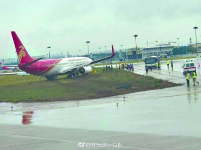 有網友將現場視頻發布在網絡上,視頻中顯示,一架深圳航空的飛機停在機場跑道旁的草坪上,草坪上有明顯的飛機輪胎印記,多輛救援車輛及機場大巴停靠在飛機附近。