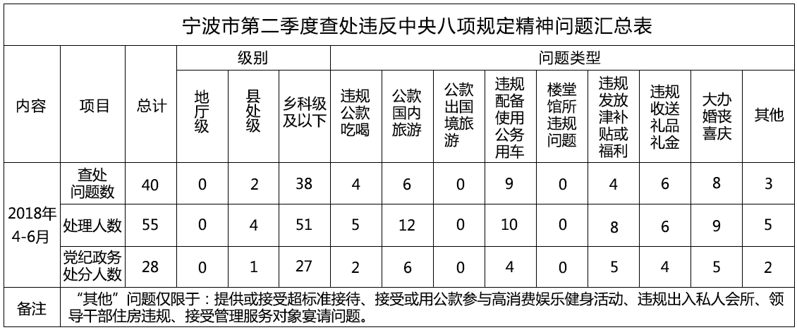 2018年4至6月,寧波市各級紀檢監察機關共查處違反中央八項規定精神問題40起,處理55人,其中給予黨紀政務處分28人。