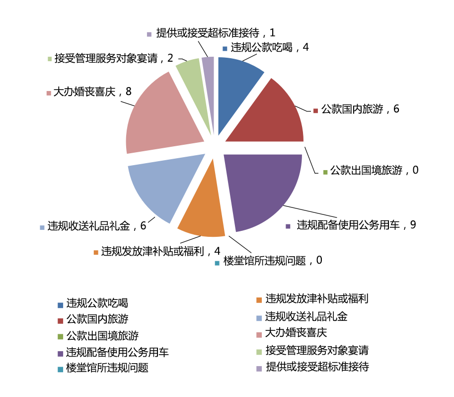 從查處問題類型看,違規問題數量較多的分別是違規配備使用公務用車問題(9起)、大辦婚喪喜慶問題(8起),公款國內旅游問題(6起)、違規收送禮品禮金問題(6起),這四類問題占查處總數的72.5%;從處理干部級別看,查處縣處級干部4人,占7.3%;鄉科級及以下干部51人,占92.7%。(寧波市紀委監委)