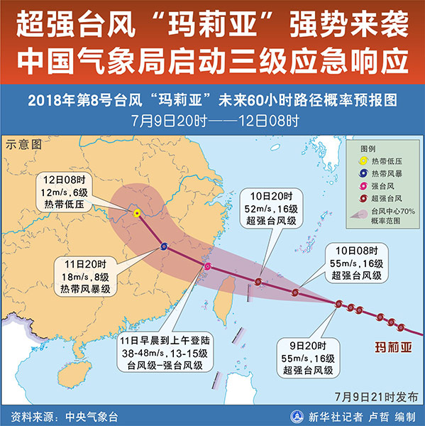 中央氣象臺預(yù)報(bào),今年第8號超強(qiáng)臺風(fēng)“瑪莉亞”中心9日8時(shí)位于臺灣省宜蘭縣東偏南方約1260公里的西北太平洋洋面上。預(yù)計(jì)將以每小時(shí)30公里左右的速度向西偏北方向移動,逐漸向臺灣以東洋面靠近,將于10日夜間登陸或擦過臺灣東北部,并于11日早晨到上午在福建晉江到浙江溫州之間沿海再次登陸。登陸后繼續(xù)向西北方向移動,強(qiáng)度逐漸減弱。