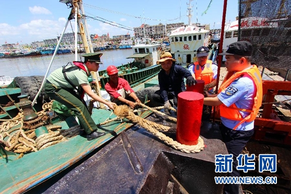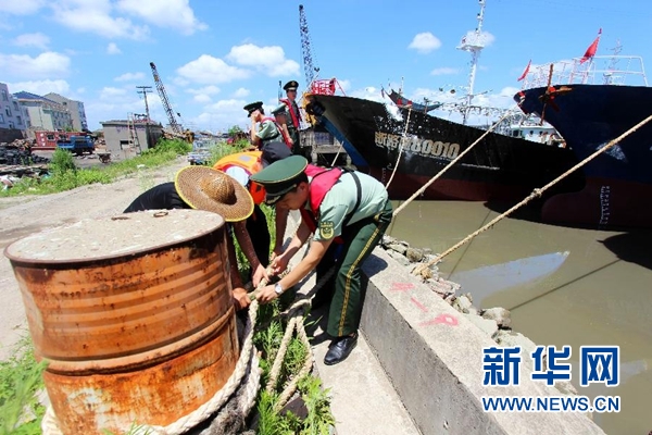 7月10日,在浙江省臺州市路橋區金清港,公安民警與邊防官兵聯合巡邏,幫助漁民做好漁船防風加固。新華社發(蔣友親 攝)