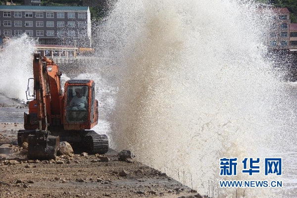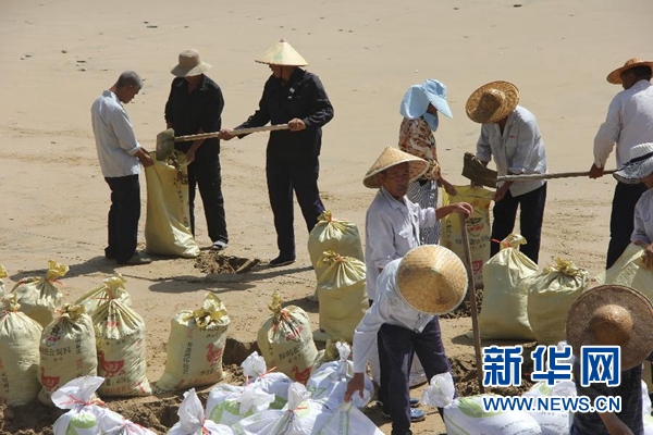 7月10日,在浙江省溫嶺市石塘鎮金沙灘,景區工作人員在進行加固堤壩作業。新華社發(金云國 攝)