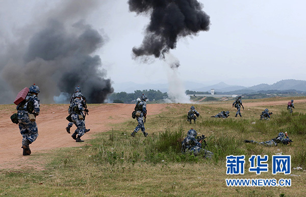 紅藍對抗中,殲“敵”信號發射后,“紅軍”主攻隊在模擬連連長指揮下,按照戰術編組發起進攻(資料照片)。新華社發(姚立 攝)