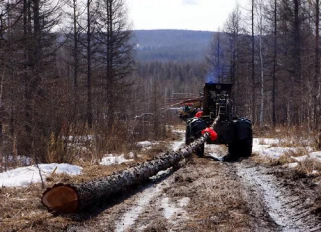 2015年3月28日,內蒙古大興安嶺圖里河林業局砍伐的最后一段木材被運下山 鄒儉樸/攝