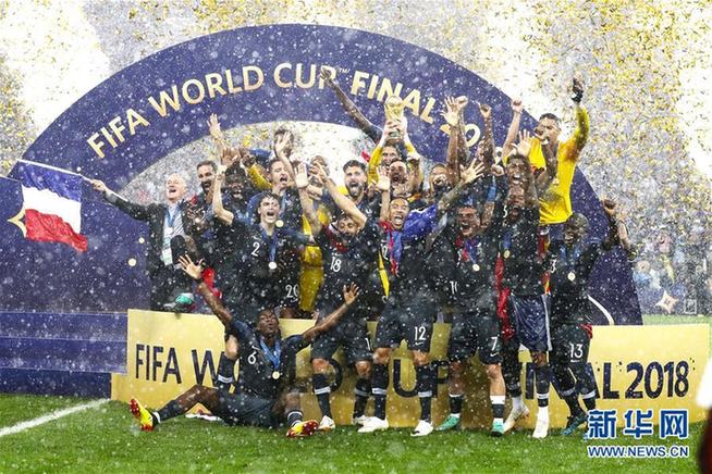 圖為2018年7月15日,在莫斯科進行的2018俄羅斯世界杯足球賽決賽中,法國隊球員在頒獎儀式上慶祝。法國隊以4比2戰勝克羅地亞隊,繼1998年后再奪世界杯冠軍。新華社記者曹燦 攝