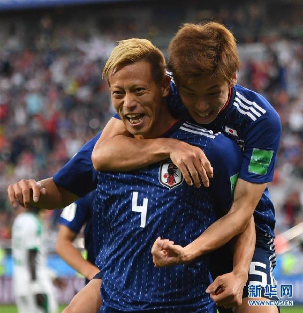 圖為2018年6月24日,在葉卡捷琳堡進行的2018俄羅斯世界杯足球賽H組小組賽日本隊對陣塞內加爾隊的比賽中,日本隊球員本田圭佑(左)在進球后慶祝。最終,日本隊以2比2戰平塞內加爾隊。新華社記者劉大偉 攝
