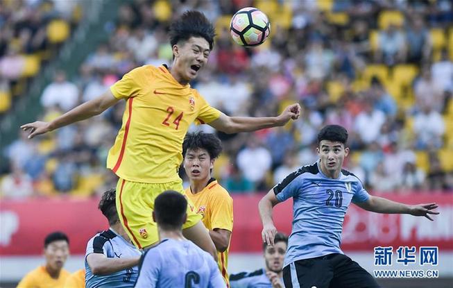 圖為2018年5月27日,在四川成都舉行的2018“熊貓杯”國際青年足球錦標賽中國U19國家青年隊對陣烏拉圭U19國家青年隊的比賽中,中國隊球員蔣圣龍(上)在比賽中爭頂。最終,中國U19國家青年隊以3比1戰勝烏拉圭U19國家青年隊。新華社記者薛玉斌 攝