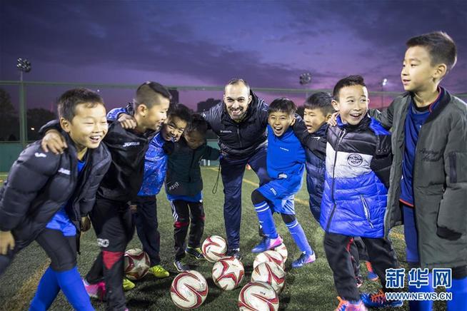 圖為2017年12月8日,在武漢市足球青訓營,西班牙巴塞羅那足球學校職業教練塞爾希奧(中)在訓練后與小學員合影。新華社記者肖藝九 攝