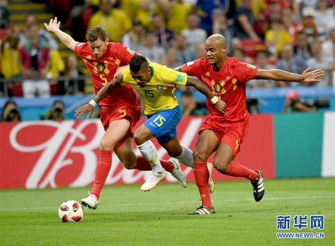 圖為2018年7月6日,在喀山進行的2018俄羅斯世界杯足球賽四分之一決賽中,巴西隊球員保利尼奧(中)與比利時隊球員維爾通亨(左)、孔帕尼在比賽中拼搶。巴西隊以1比2不敵比利時隊,無緣四強。新華社記者杜宇 攝